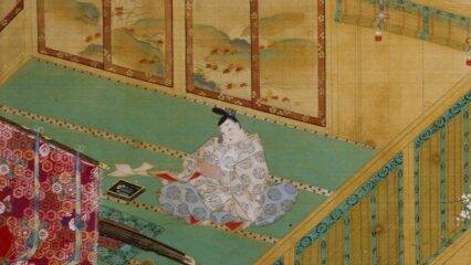 さて、ある日のこと、ウェイリーは大英博物館の一室で、いつもの通り日本画の整理をしていました。ふと、ある一枚の絵が彼の目を引きます。一人の貴公子が座し、月を眺めている絵でした。広がる海、生垣のある侘しい住まい、悲しげな眼差し……、物語の一節の画賛(がさん)もありました。