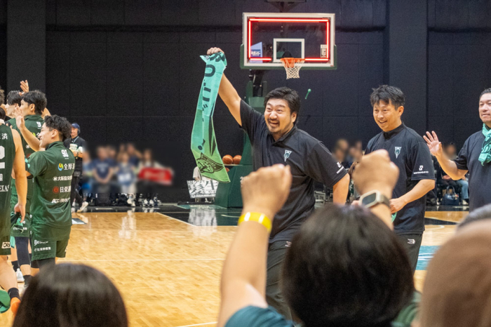チームの指揮官・川辺HCの掛け声「勝ったどー」をデザインしたマフラータオル。