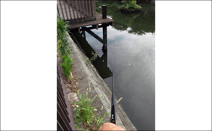 ヘチの石積み護岸の斜面に、大小の魚が折り重なるようにへばりついている。だが、動きが鈍い。とりあえず、魚影が濃そうな所で竿を出す。