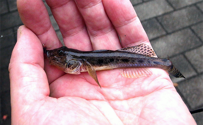 ウキ下を30cmに取り、護岸の斜面にエサを止める。反応が今ひとつなので、ウキを上下してエサを踊らせて誘いをかけると、スーッと水中ウキが横に引かれる。何回か空振りしたあと、プルプルッときてハリ掛かり。7cmと小ぶりのハゼが釣れた。