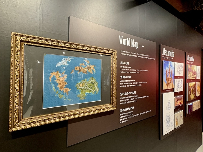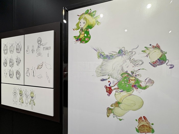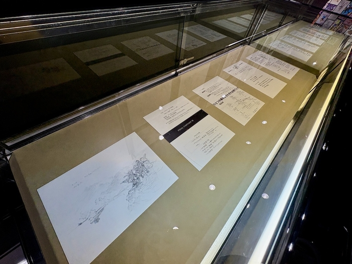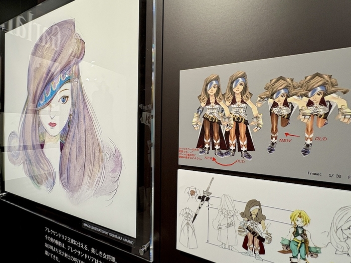 さらに会場を進むと、アートディレクターを務めた皆葉英夫による開発資料が多数展示されている。ケース内にあるのは、発売およそ2年前、1998年春の時点での「FF9」企画書だ。“原点回帰”という作品の軸は変わらないものの、企画当初とのストーリーや世界設定の違いを感じられて面白い。冒頭に、シリーズ第一作のオープニングシーンをオマージュしたイメージイラストが掲げられているのを見て胸が熱くなった。