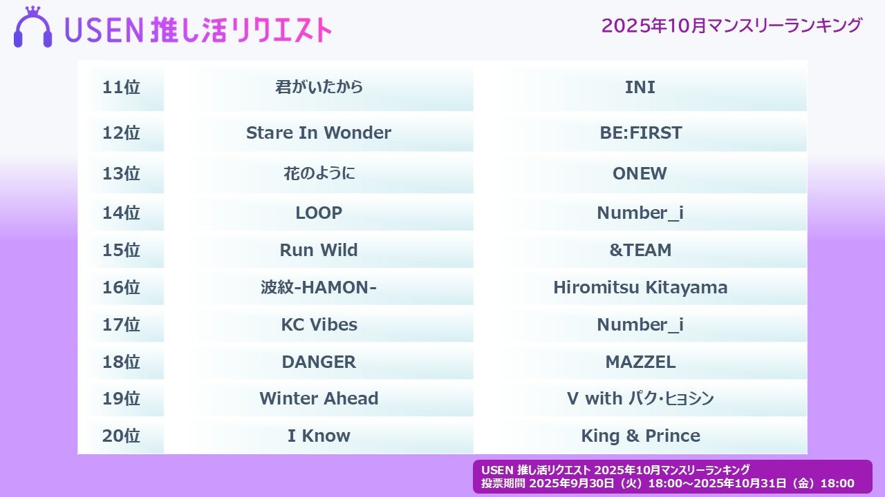 USEN 推し活リクエスト(推しリク)「2025年10月マンスリーランキング TOP20」Number_iの「Numbers Ur Zone」が1位!最新作から合計4曲がランクイン!