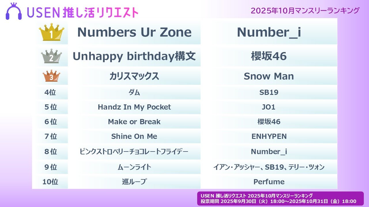 そんな「推しリク」の「2025年10月マンスリーランキング」は、Number_iの「Numbers Ur Zone」が1位に輝いた。