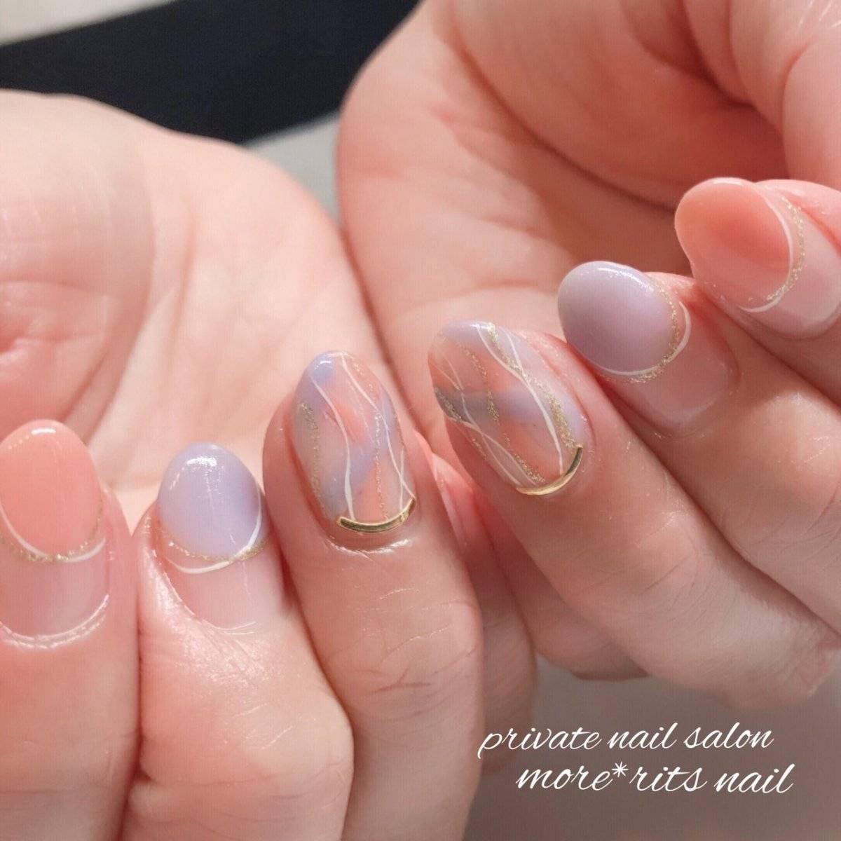 オレンジピンクだけでなく、ラベンダーやライトブルーを組み合わせることで大人っぽネイルに仕上がります。