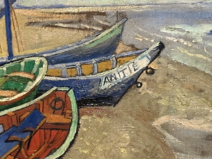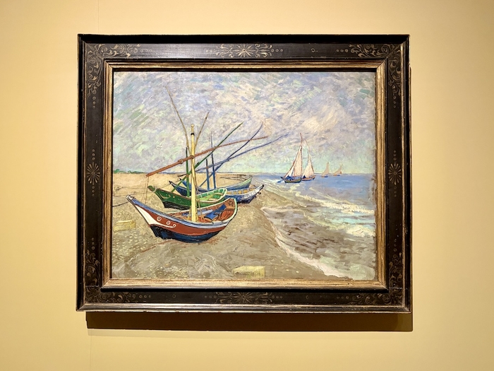 《浜辺の漁船、サント=マリー=ド=ラ=メールにて》には、アルルに着いたばかりの頃、ゴーガンら画家仲間の到着を待つファン・ゴッホの思いが滲み出ているようだ。手前の船の複雑なフォルムを鮮やかに描き出している画家の手腕は、まさに“筆がのっている”といった印象を受ける。ちなみにファン・ゴッホ自身もうまく描けたと思っていたようで、テオに対して「船の素描が、短時間でペンだけで描けた」と得意げに語る手紙が残っている。
