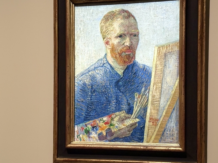 そんなファン・ゴッホがアルルへ旅立つ直前、パリ時代の最後に完成させたのが、この《画家としての自画像》である。画面全体が光に包まれているかのように明るく、画家が手にしたパレットにはこれ見よがしにカラフルな絵の具が配置されている。自分は時流に乗った最先端のアートを生み出している、との自負に満ちているようである。この自画像についてはとても興味深い解説が添えられており、それによると、後にヨーは「数ある自画像の中でも、義兄フィンセントの生前の姿に最も近いのはこの自画像だ」と回想しているらしい。ところが一方で、ファン・ゴッホ自身はこの自画像を「死神の顔のよう」で、「自分自身を描くのは簡単じゃない」……と明確に自分に似ていないとコメントしているのである。本作をメインビジュアルとしたゴッホ展が開催されていると知ったら彼はどう思うのだろうか。もしかしたら「ジョン・ピーター・ラッセルの描いた肖像画(例のお気に入りの1枚)を使ってくれ」と言うのかもしれない。