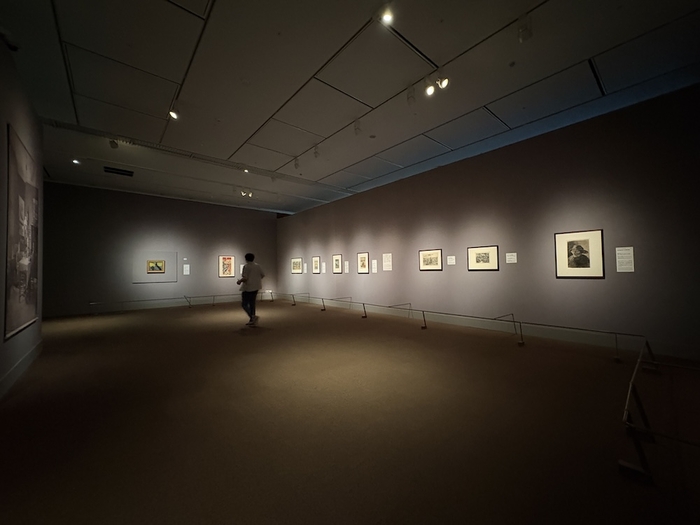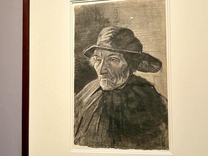 影響がわかりやすいように、すぐ横にはファン・ゴッホ作品が並べて展示されている。この《防水帽を被った漁師の顔》はいわば画家の素描特訓時代のもので、画業の超初期に描かれたものだ。何気なく通過してしまいそうだが、この白黒の小さな作品には鉛筆・リトクレヨン・チョーク・筆・インク・水彩という6種類もの画材が使われている。新聞の挿絵版画で白と黒のコントラストを学んだファン・ゴッホが、白い紙にあらゆる種類の黒い画材を試し、見え方を研究している様子がうかがえる。