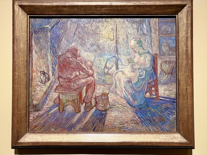 サン=レミ時代の作品の中では、ファン・ゴッホが心の平穏を取り戻すために取り組んでいたというミレー作品の模写に注目したい。一日の終わりの「夜」の光景を描いた1枚だ。傍の暖炉の火を差し置いて、室内を照らすランプが太陽のように明るい。ランプの灯りで手を動かす農民というのは全時代を通じてファン・ゴッホが好んで描いたテーマだが、本作は異常なほどのランプの光量が印象的な一作となっている。画家の昂った神経がそう描かせたのか、それとも小さなランプに希望や神の臨在といった意味を持たせているのか。じっと見つめていたくなる作品だ。