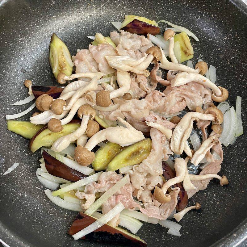 しめじと玉ねぎも加え、さらに3分ほど全体に火が通るまで炒めますよ。
