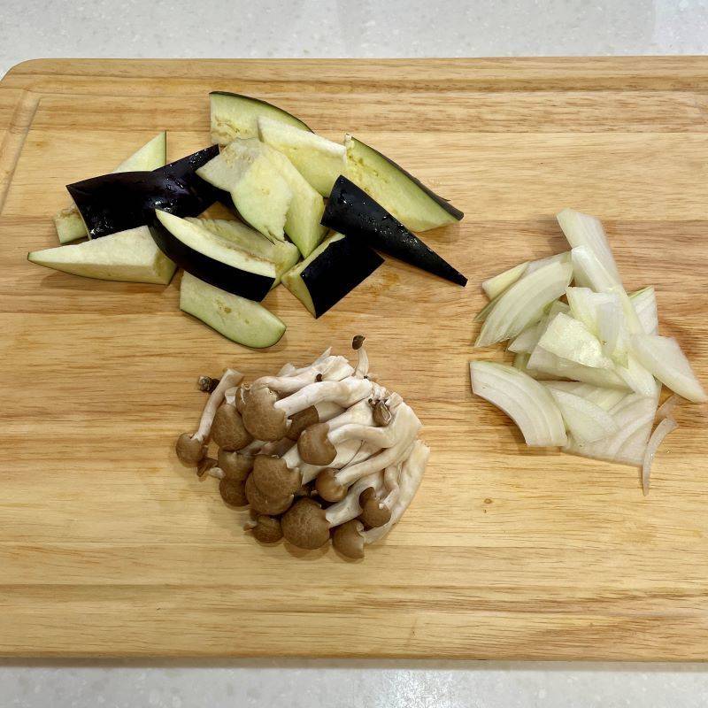 玉ねぎは細切りにし、しめじは石づきをとってほぐします。