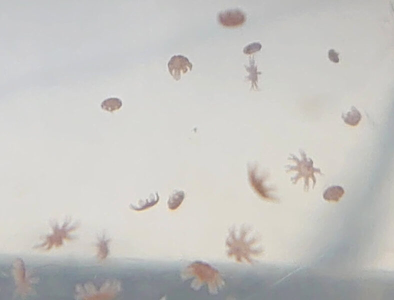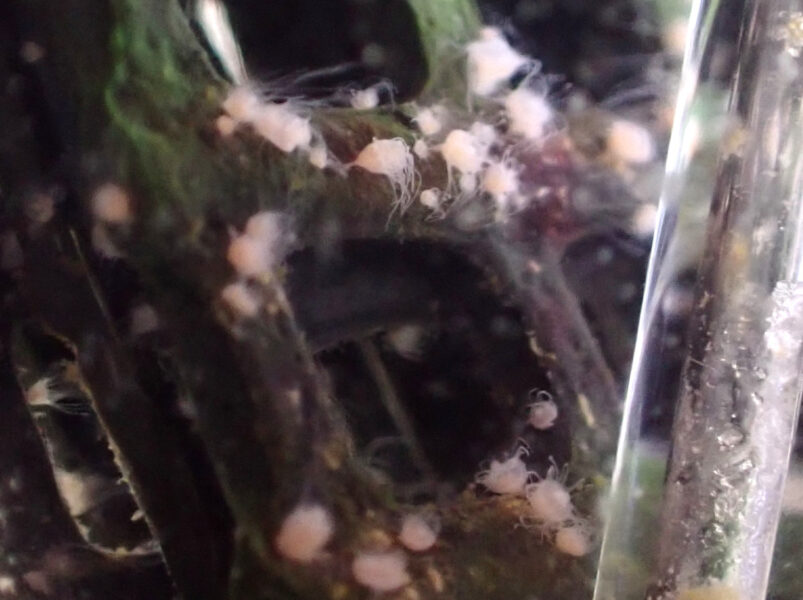 受精卵はプラヌラ幼生となり、着生する場所を探し、着生するとポリプとなり、エサを食べるようになります。