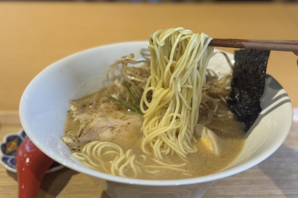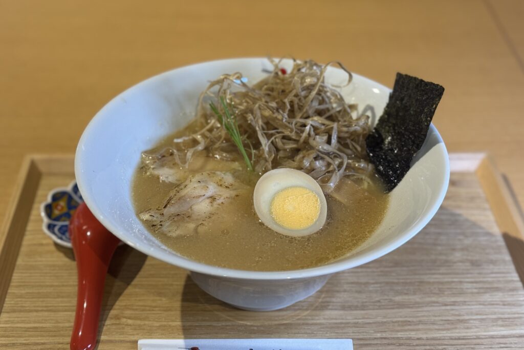 炙りチキンチャーシューにたっぷりのごぼうチップスなどトッピングが豪華。野菜スープをベースにしつつ、しっかりとした旨味と味噌のコクが重なり、深みのある味わいに。ごぼうやチャーシューからも旨みが溶け出し、満足度の高い一杯です。
