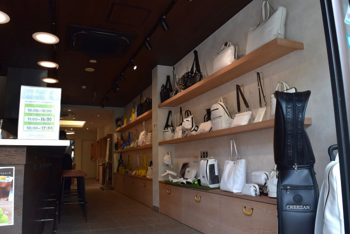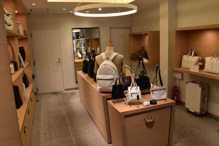 奥に入るとおしゃれな棚に上質な鞄が並ぶショップになっています。