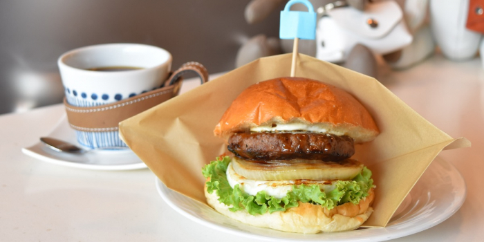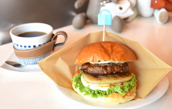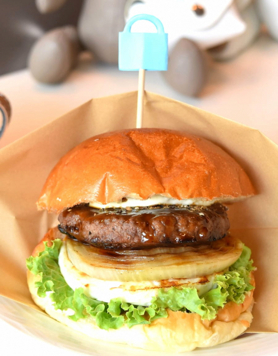 かばんに夢中になりましたが、いよいよ本題のハンバーガーを実食!どれにしようか迷いましたが、石家(いしや)さんおススメのクリームチーズと山椒が入っている「大人てりやきバーガー」にしました。