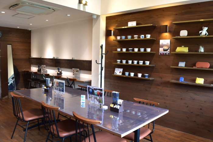 2階にもカウンター席が2か所6席ずつあり、真ん中には6人掛けのテーブルが1つあります。出石焼のマグカップなど、素敵な器や革製品が可愛く展示されています。カフェだけでも、革製品を見るだけでも楽しいので、フラッと立ち寄るのにぴったりなお店です。