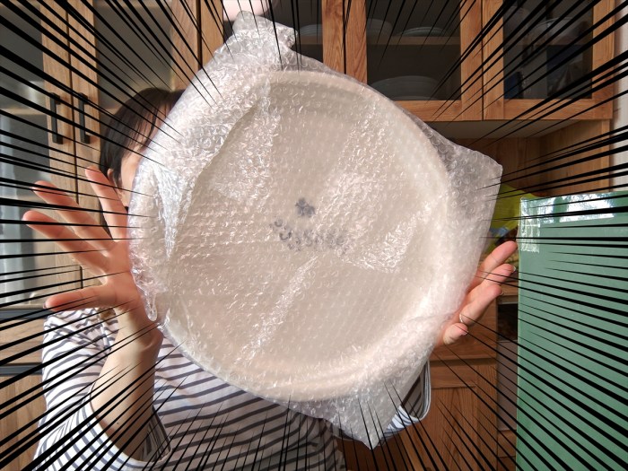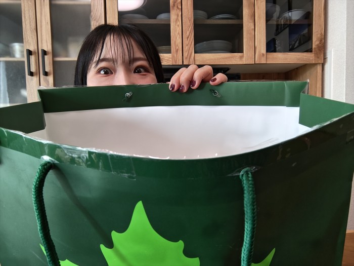 袋の口がピッチリとテープで閉じられているが、硬くて重い金属っぽいものが入っているようだ。筆者の予想では、ホットサンドメーカーやお皿が入っているんじゃないかしら?