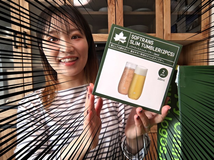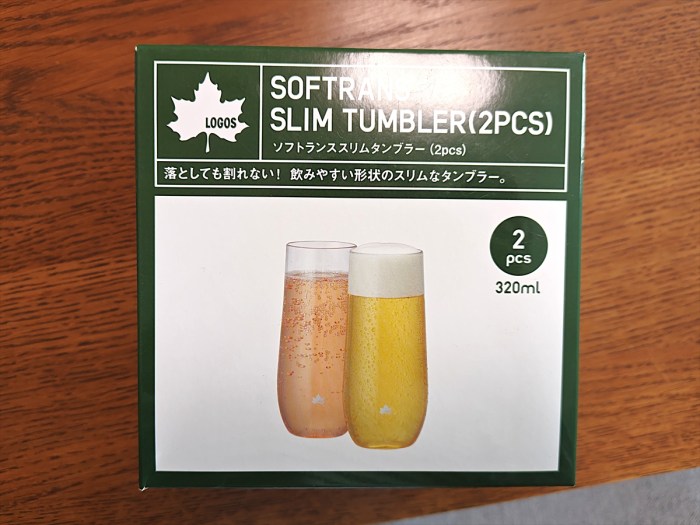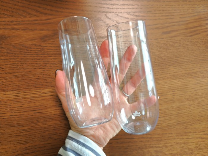 樹脂でできた細身のグラスの2個セットは、定価1485円。
