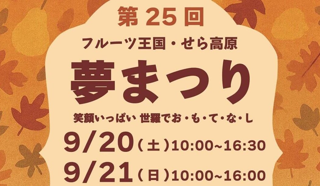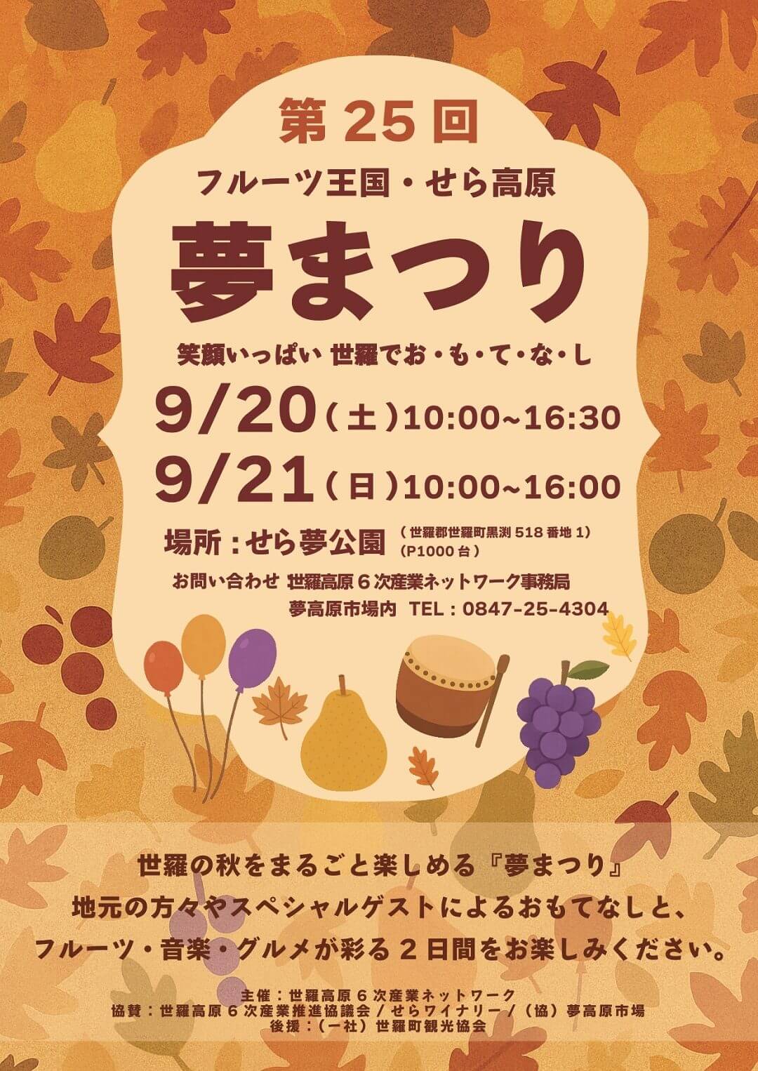 2025年9月20日(土)、21日(日)の2日間、世羅町のせら夢公園(せらワイナリー)を会場に「第25回フルーツ王国せら高原夢まつり」が開催されます。