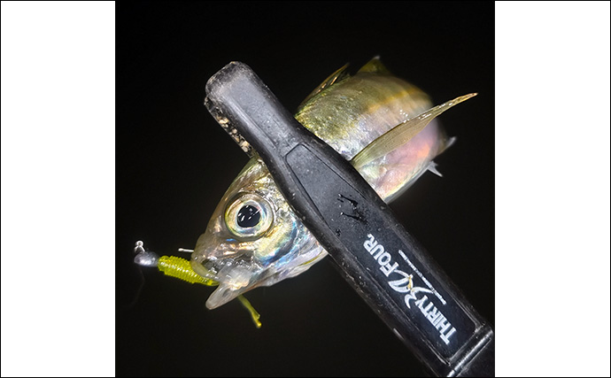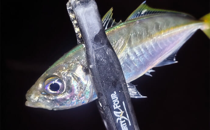 次に入った大型漁港の一角では、最初は底でアタリが続くもののなかなか乗らない。思い切ってレンジを上げ、水面下50cmほどの浅い層を通してみると、これがドンピシャ。20cm前後のアジが安定してヒットし、さらに 25cm近い良型が1匹だけ混じる嬉しい展開もあった。