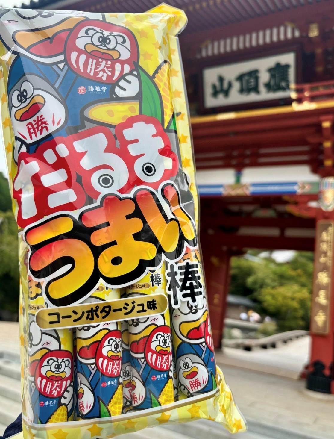 大阪府箕面市の「勝尾寺」では、株式会社やおきんとコラボした、コーンポタージュ味の「だるまうまい棒」を販売開始! 寺社仏閣初となる「コラボレーションうまい棒」となっています。