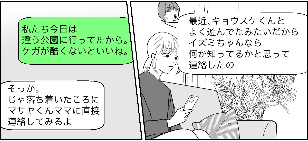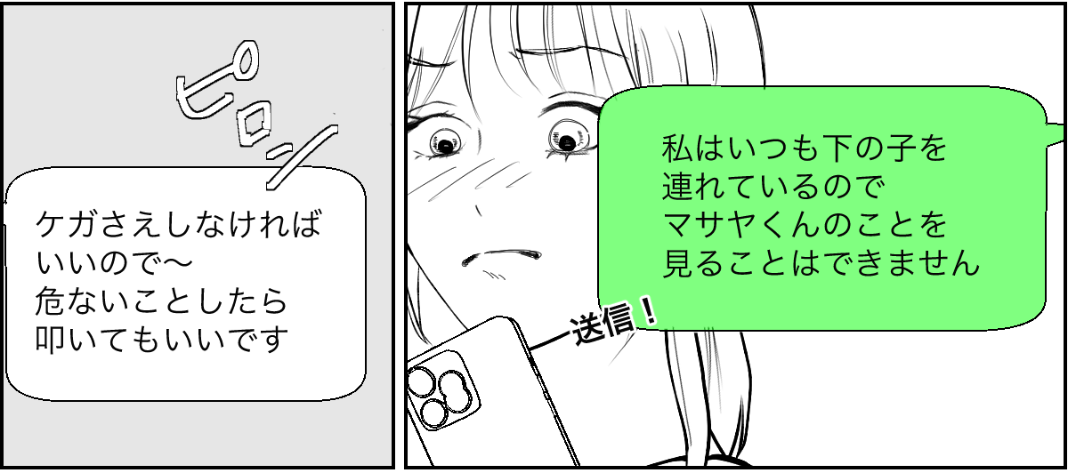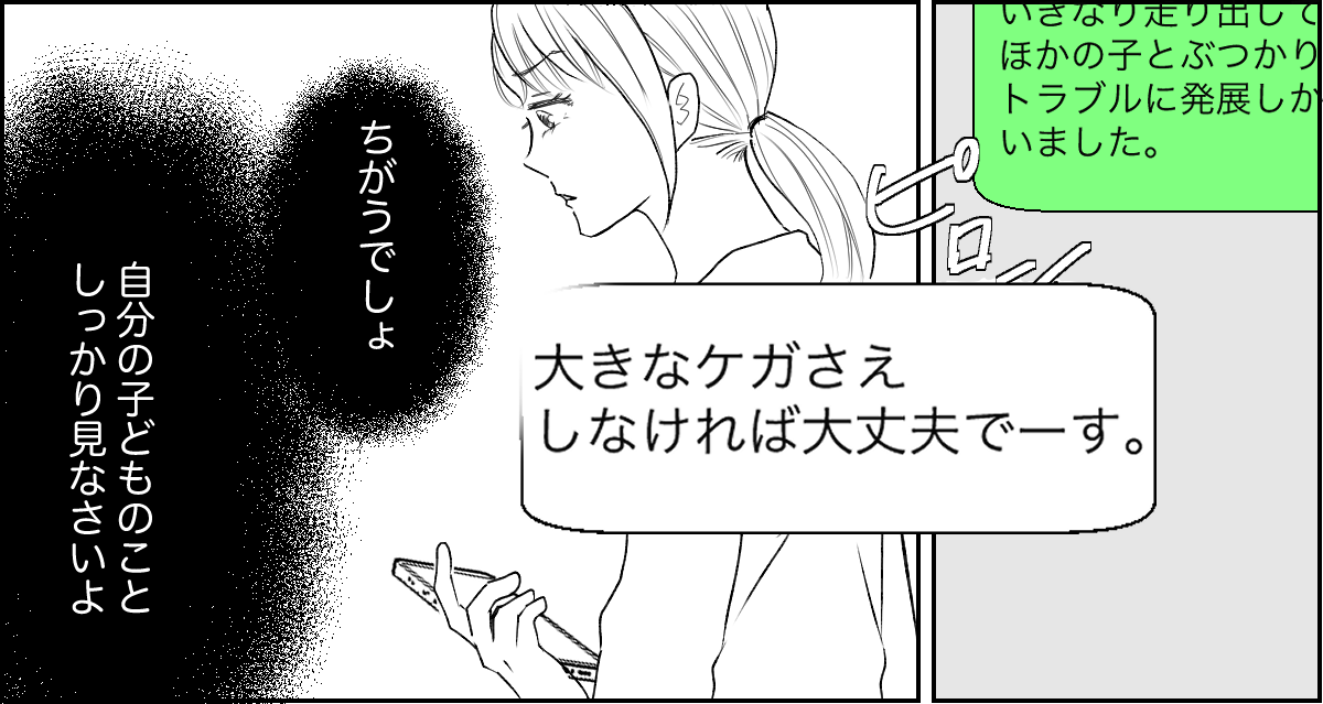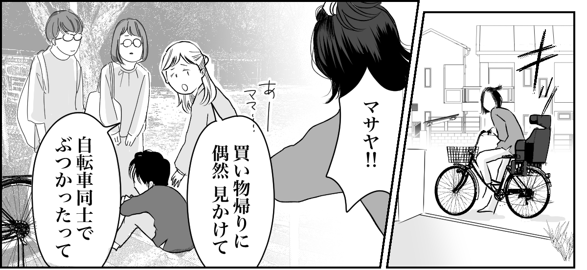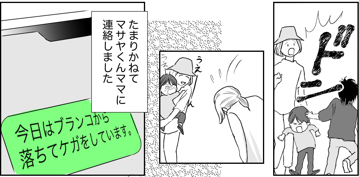 私は、もし今日マサヤくんといつもの公園で一緒にいたら……? と考えてしまいました。私が面倒を見ているときにケガをしてしまっていたら、マサヤくんママから責任を追及されたのかもしれません……。