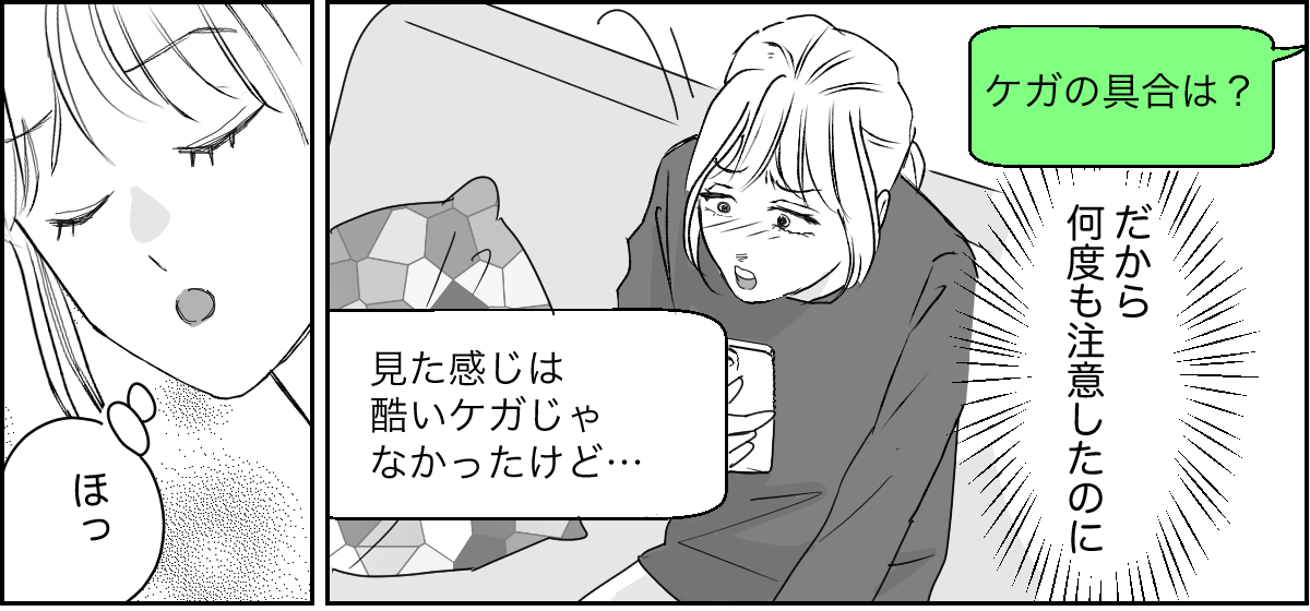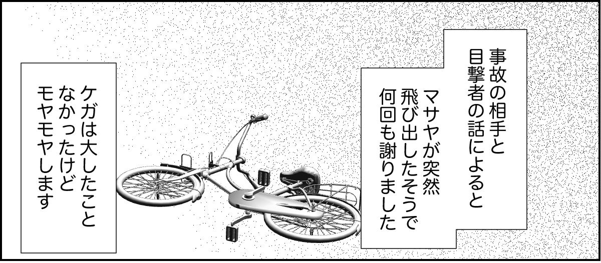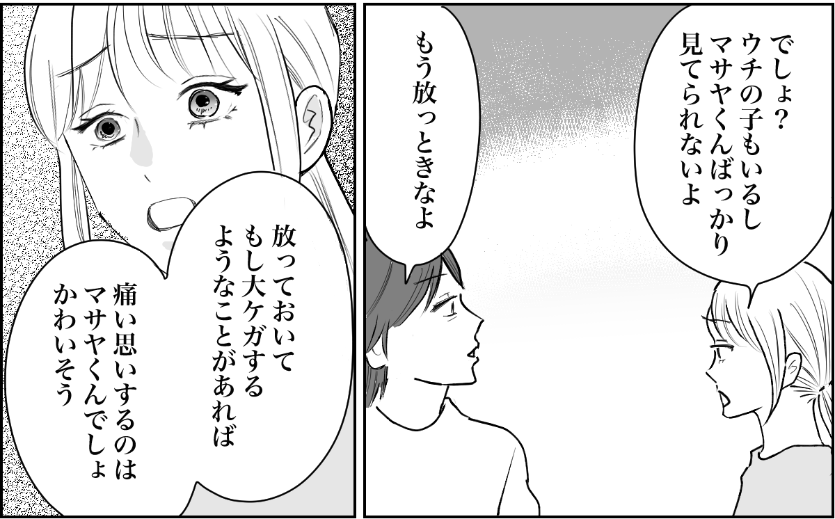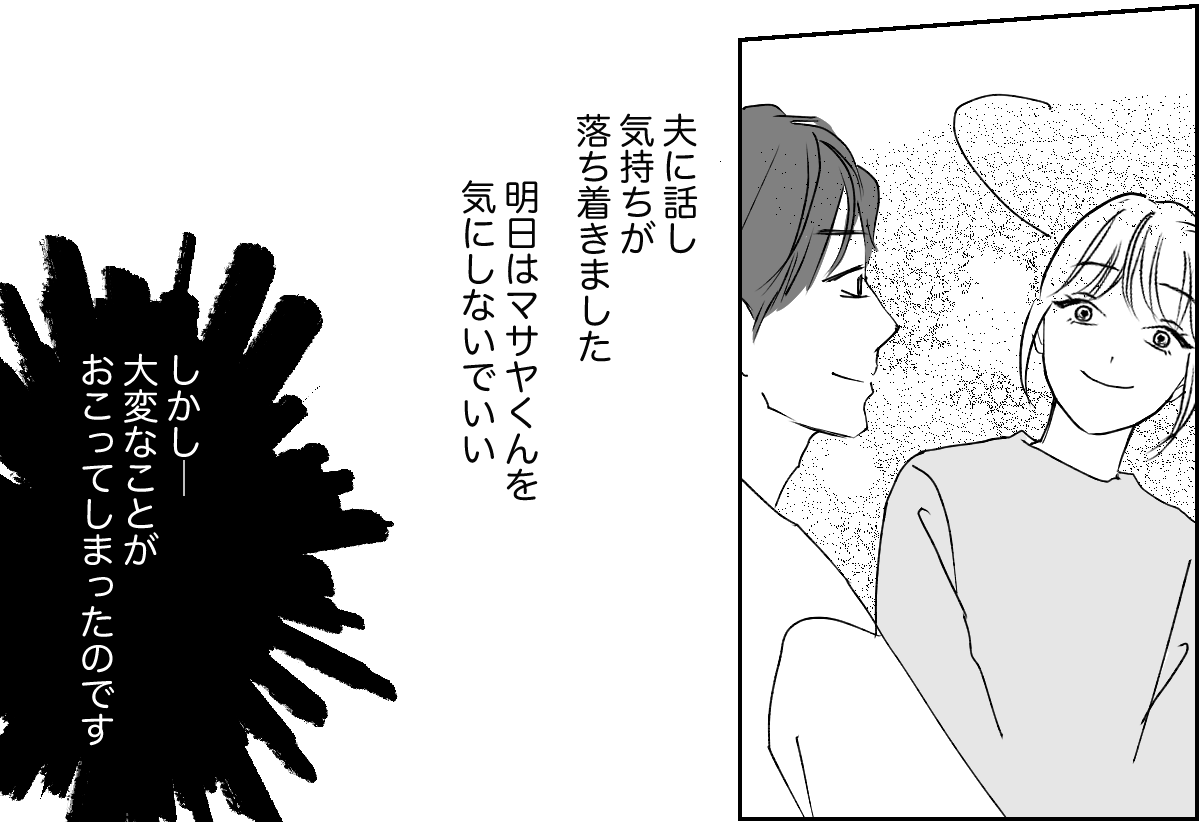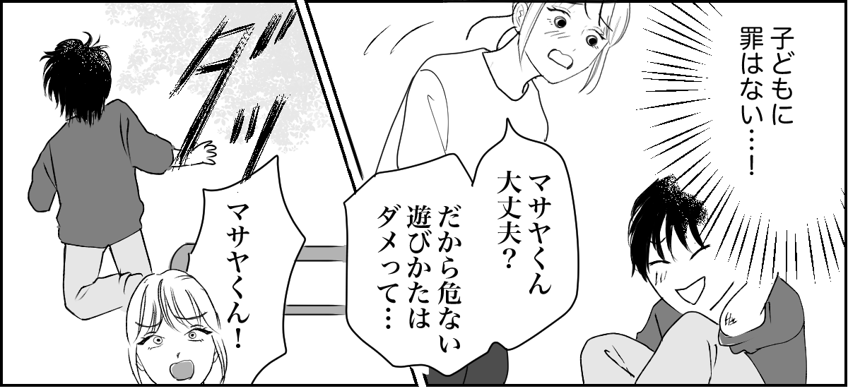 私は、もし今日マサヤくんといつもの公園で一緒にいたら……? と考えてしまいました。私が面倒を見ているときにケガをしてしまっていたら、マサヤくんママから責任を追及されたのかもしれません……。