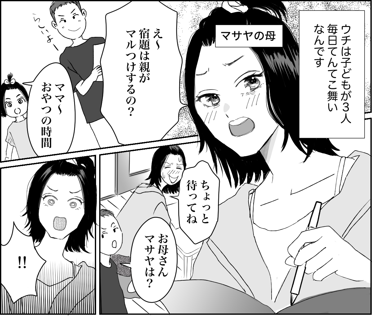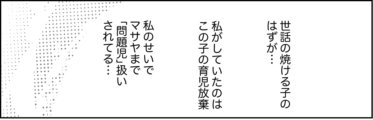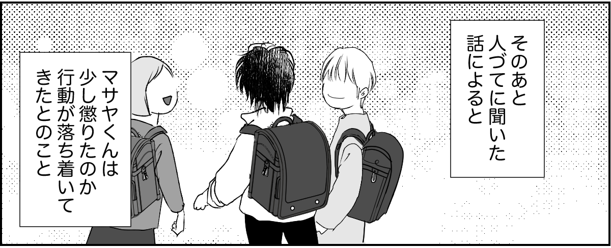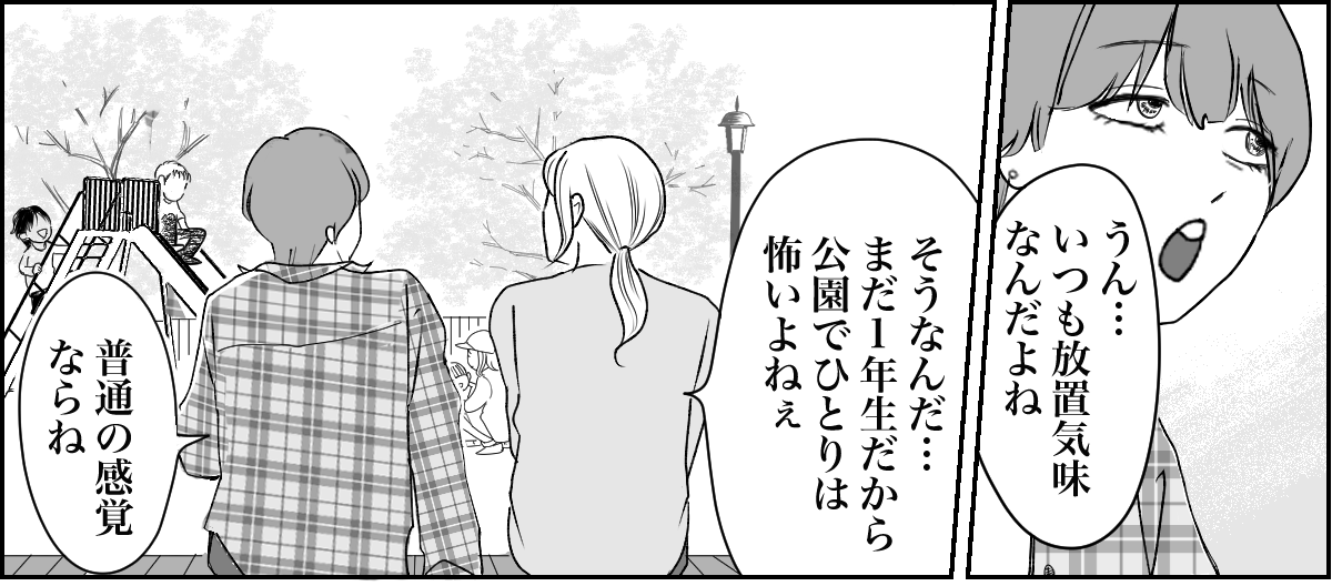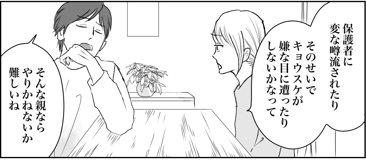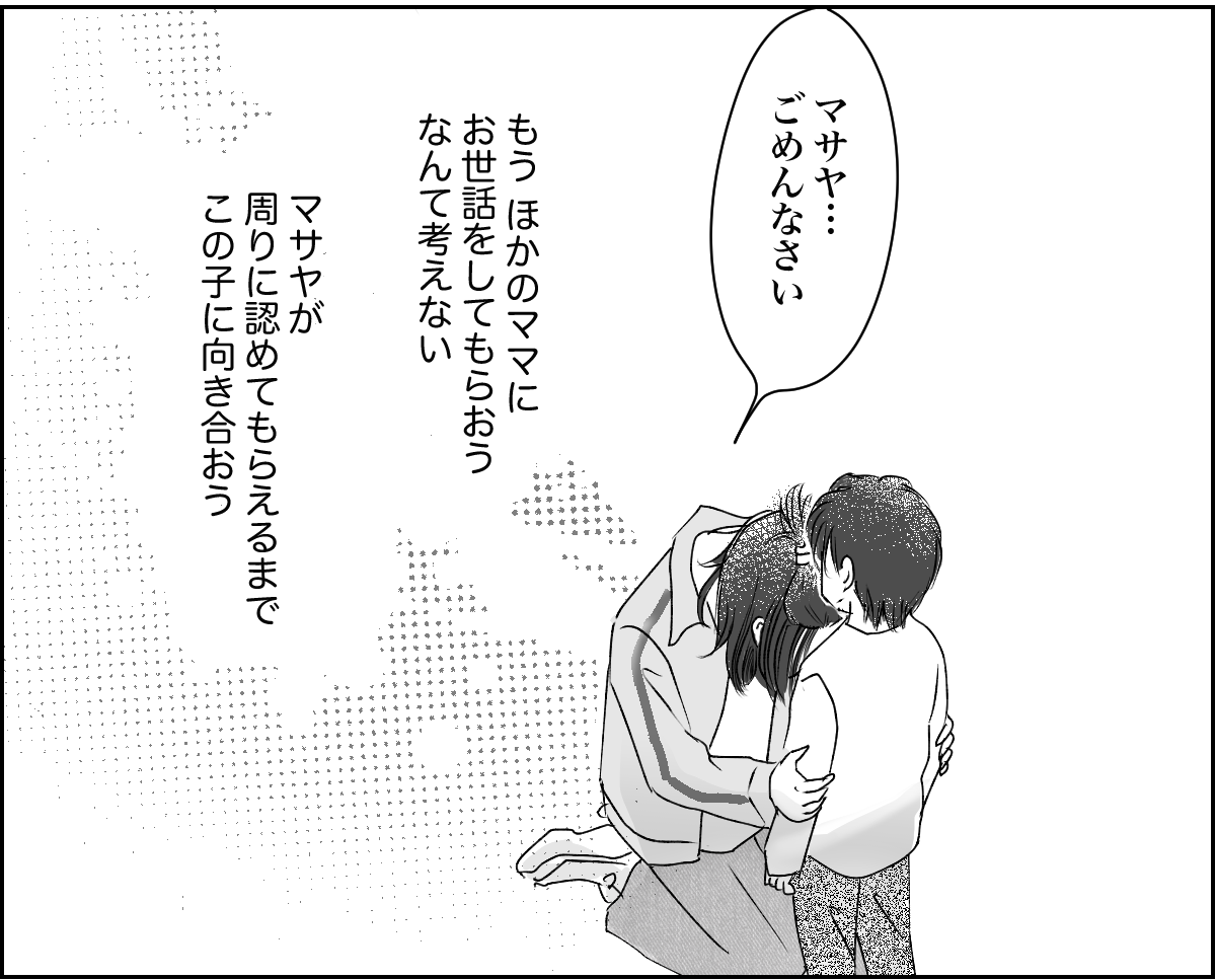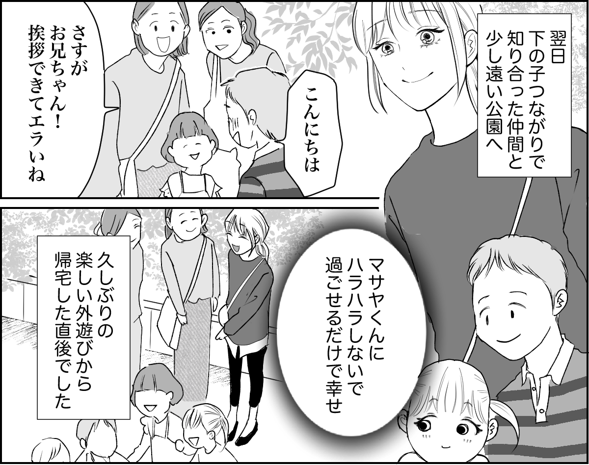 保護者会に赴いたところ、ほかのママたちが私の噂をしているのを聞いてしまいました。もちろん内容は私にとって嬉しいものではありませんでした。 しかし今考えてみれば、他人に育児を押し付けていたのですから、煙たがられるのは当然のことでしょう。しかし皮肉にもその経験が、改めてマサヤに向き合うきっかけになりました。今では登下校に付き合ったり、一緒に公園遊びをしたりと、できる限り子どもと一緒に過ごしています。 これからはきちんと子どもたちに向き合おうと思います。