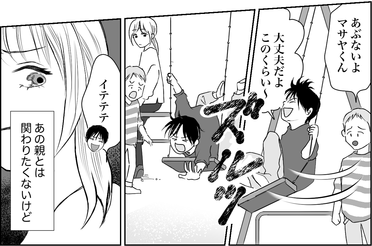 公園でキョウスケとマサヤくんが遊ぶのを見ていた私。しかし私がちょっと目を離した瞬間に、マサヤくんがブランコから落下。また、いきなり遊具に走り出していったかと思ったら、通行人にぶつかってしまいました。ケガを心配したり、謝る羽目になったり、もううんざりです……。 しかしそれをマサヤくんママに報告しても、「うちの子は大きなケガさえしなければ大丈夫でーす」と話のピントが合いません。私はこのままずっと、マサヤくんのお世話をしないといけないのでしょうか。