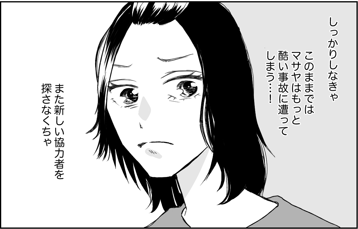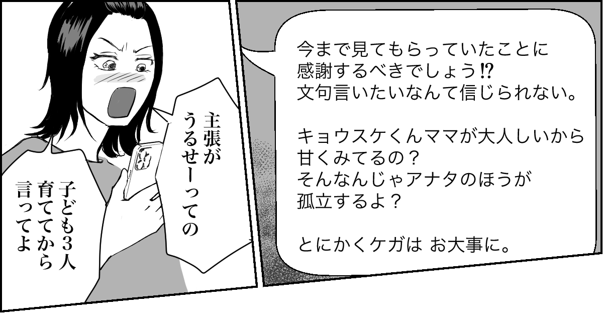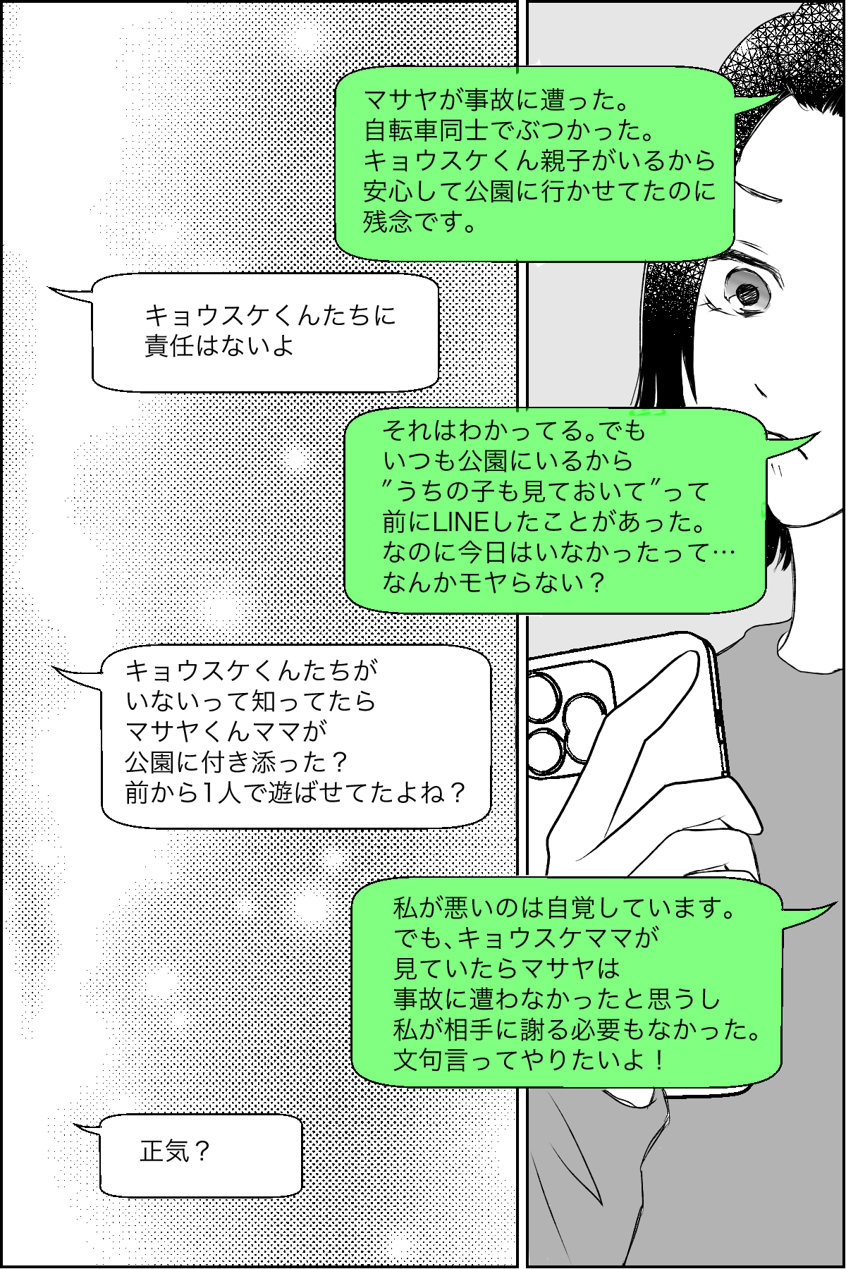 マサヤが事故に遭って本当にびっくりしました。「キョウスケママが見ててくれたらよかったのに」「なんでその場にいなかった私が謝らないといけないの」と、私の頭はモヤモヤでいっぱい。 そんなときにハルカちゃんママから連絡がきて、思わず愚痴ってしまいました。しかし共感してもらえるどころか諭されてびっくり。ハルカちゃんママもキョウスケママも薄情です。子どもは地域で育てるものなのに……。私はほかの協力者を探さないといけないようです。