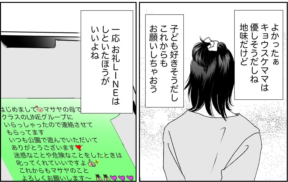 とはいえ私はそこまでマサヤくんママと関わったこともなかったので、「そうなんだ」と軽く流しました。後に自分がロックオンされるとも知らずに……。