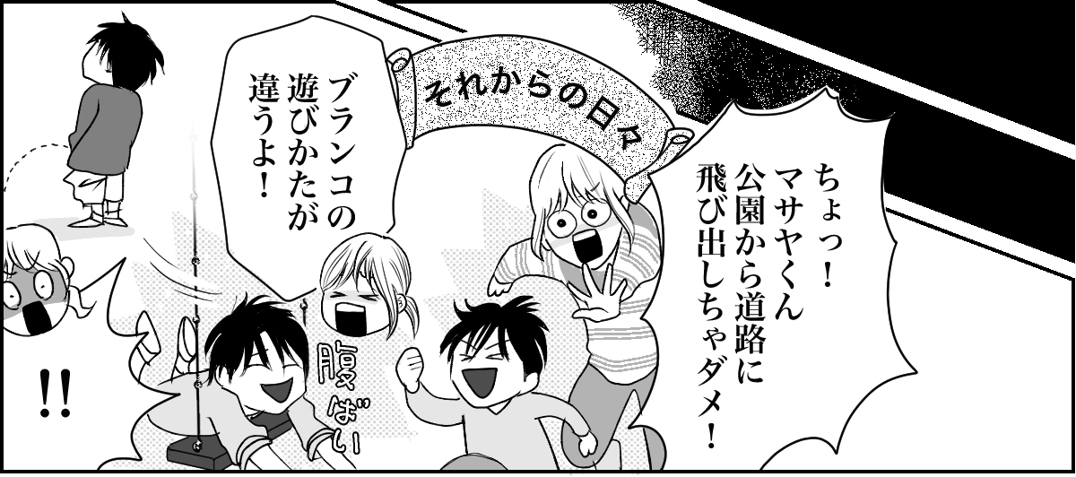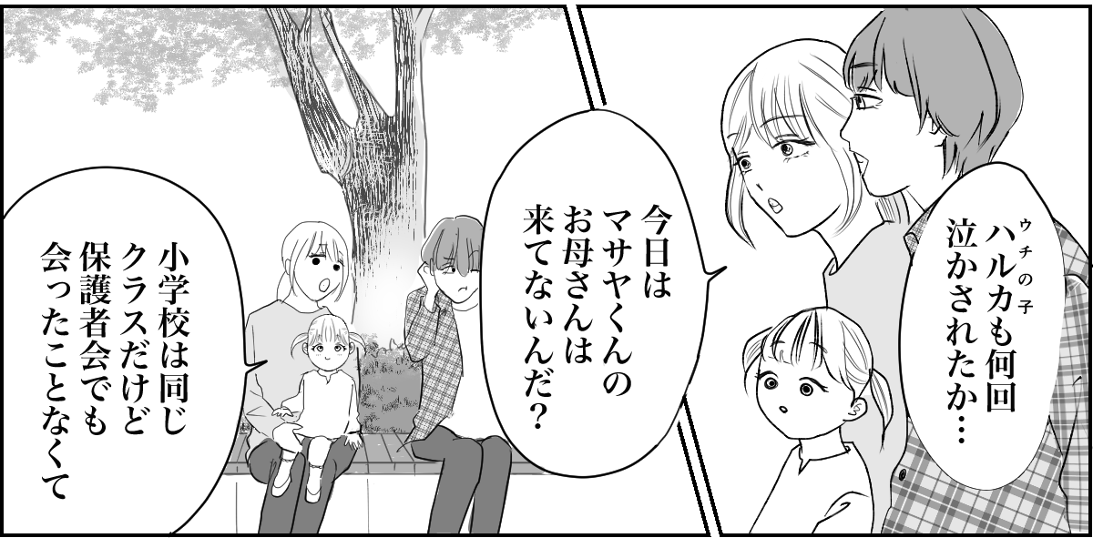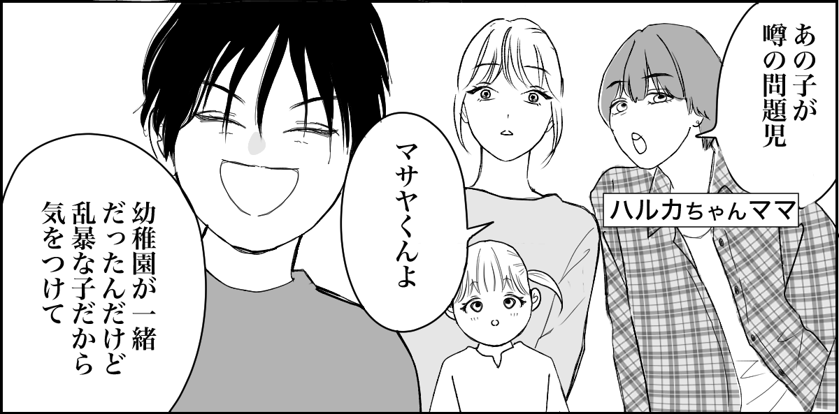 キョウスケもユカも公園遊びが大好きで、私たち親子3人は毎日のように公園で遊んでいます。そこで、ハルカちゃんママから噂の問題児だという「マサヤ」くんのことを教えてもらいました。