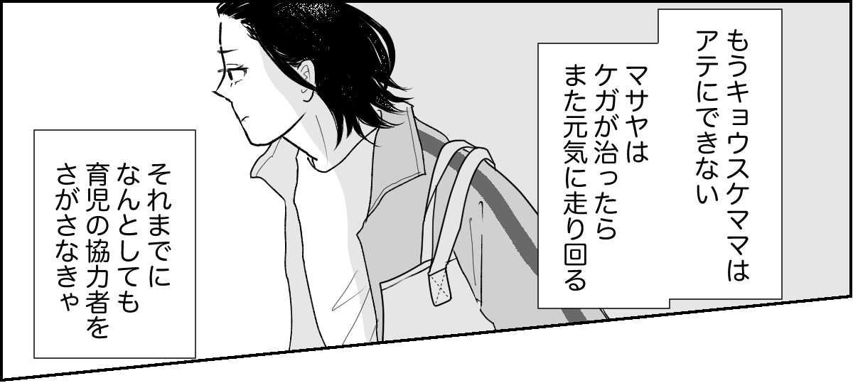 事故に遭ってしまったマサヤ。病院に連れていくことになり、「もうこんなことが起こってほしくない」と心から思いました。 こんなことになるのなら、キョウスケママ任せにはできません。それならばと新たにお願いできる人を探すため、私は保護者会に出ることにしました。ところがそこで聞いてしまったのは、私がほかの保護者から避けられている事実とその理由でした。私がほかのママたちに育児を手伝ってもらっていること、キョウスケママに腹をたてていることなどがすべてバレていました……。