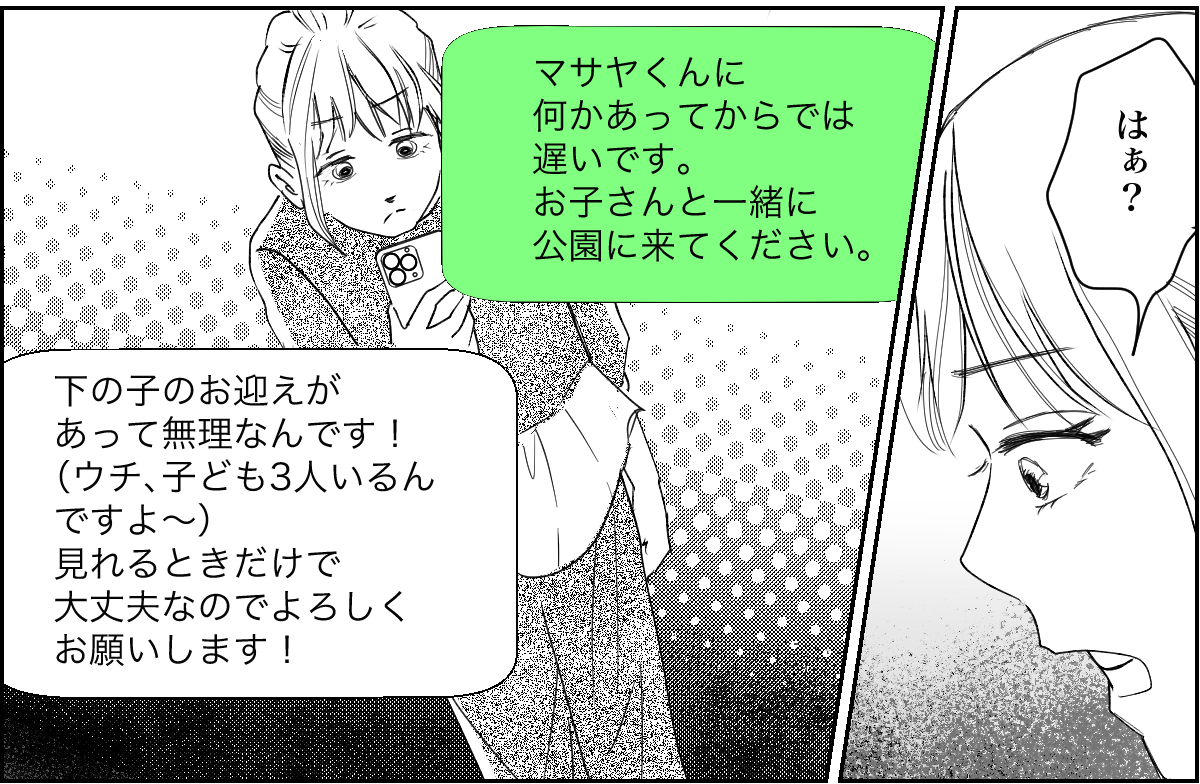 きっとマサヤくんママは私の常識とは全くかけ離れたところにいる人なのでしょう。仕方なく私は、それ以上連絡するのをやめました。そして次の日公園に行くと、そこにはやはり今日もマサヤくんの姿が……。