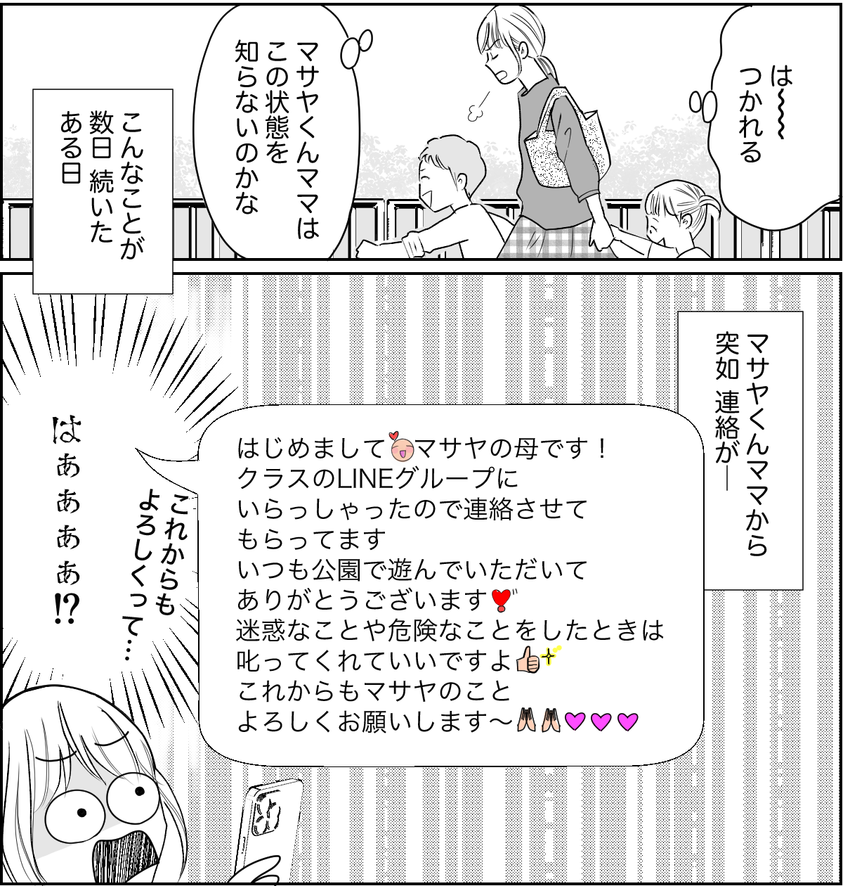 マサヤくんママとはこれ以上関わりたくないけど、子どもであるマサヤくんに罪はありません……。私は気持ちを切り替えていつも通り、声を掛けました。