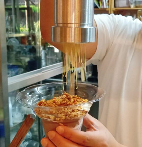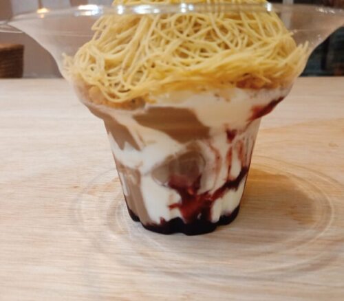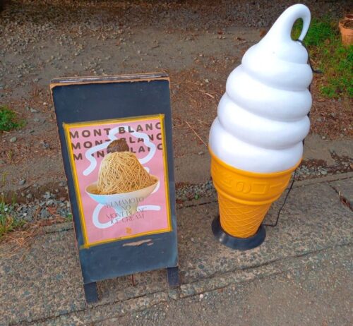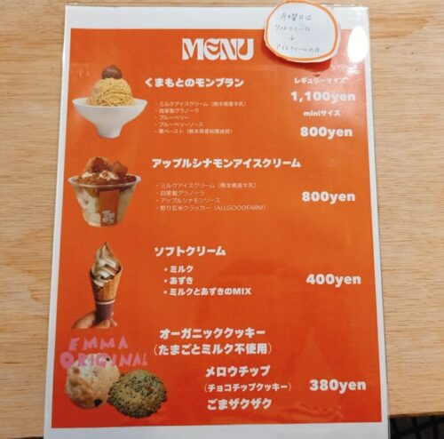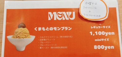 月曜日のみアイスクリームというのは、定休日にソフトクリームの機械を洗浄するので、フードロスが出ないようにするためだそう。 (アイスとソフトの違いって冷やす温度だけなのはご存じでした?ライターは初耳!) お店のおすすめは「くまもとのモンブラン」。 サイズが選べてレギュラー1,100円・mini800円。 本体(ソフトクリーム他)の量は同じで、ミニの方が上にかかるモンブランの量が半分。