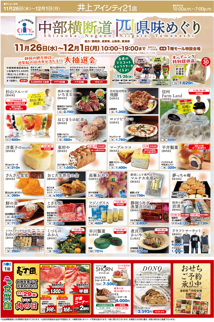 11/26(水)~12/1(月)静岡・山梨・長野・新潟のおいしいグルメが大集合『中部横断道四県 味めぐり』静岡のうなぎ・カツオのたたき・みかん・焼き菓子・プリンなど「井上アイシティ21」@長野県 山形村