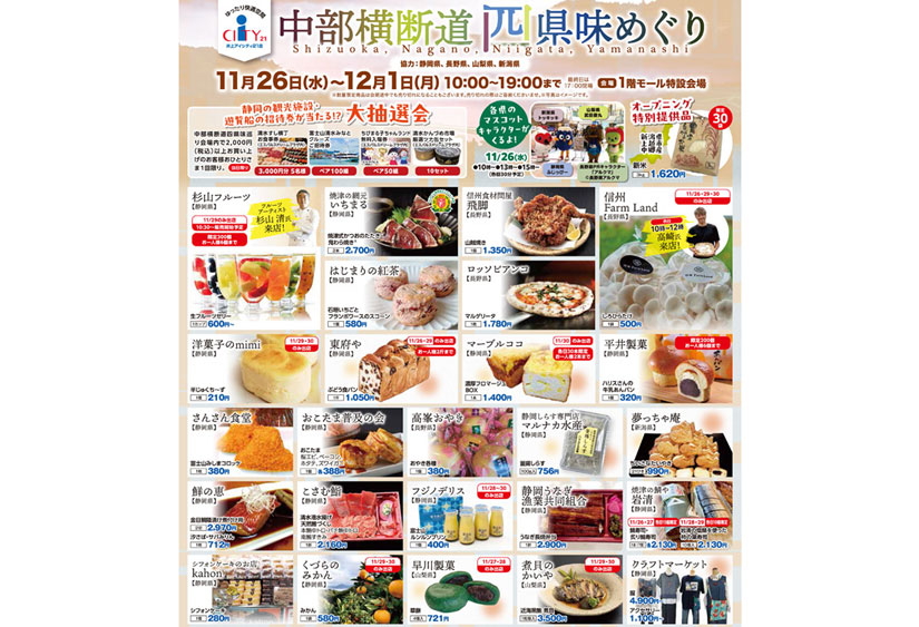松本市の「信州スカイパーク」から約10分ほどにある山形村の大型複合商業施設「井上アイシティ21」で、4県(静岡県・山梨県・長野県・新潟県)の自慢の味覚が大集合するイベント『中部横断道四県味めぐり』が、2025年11月26日(水)~12月1日(月)に開催。