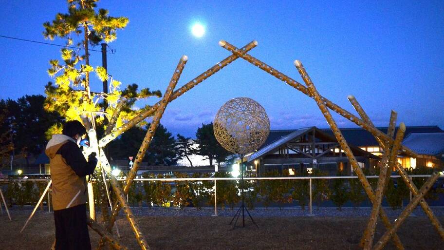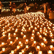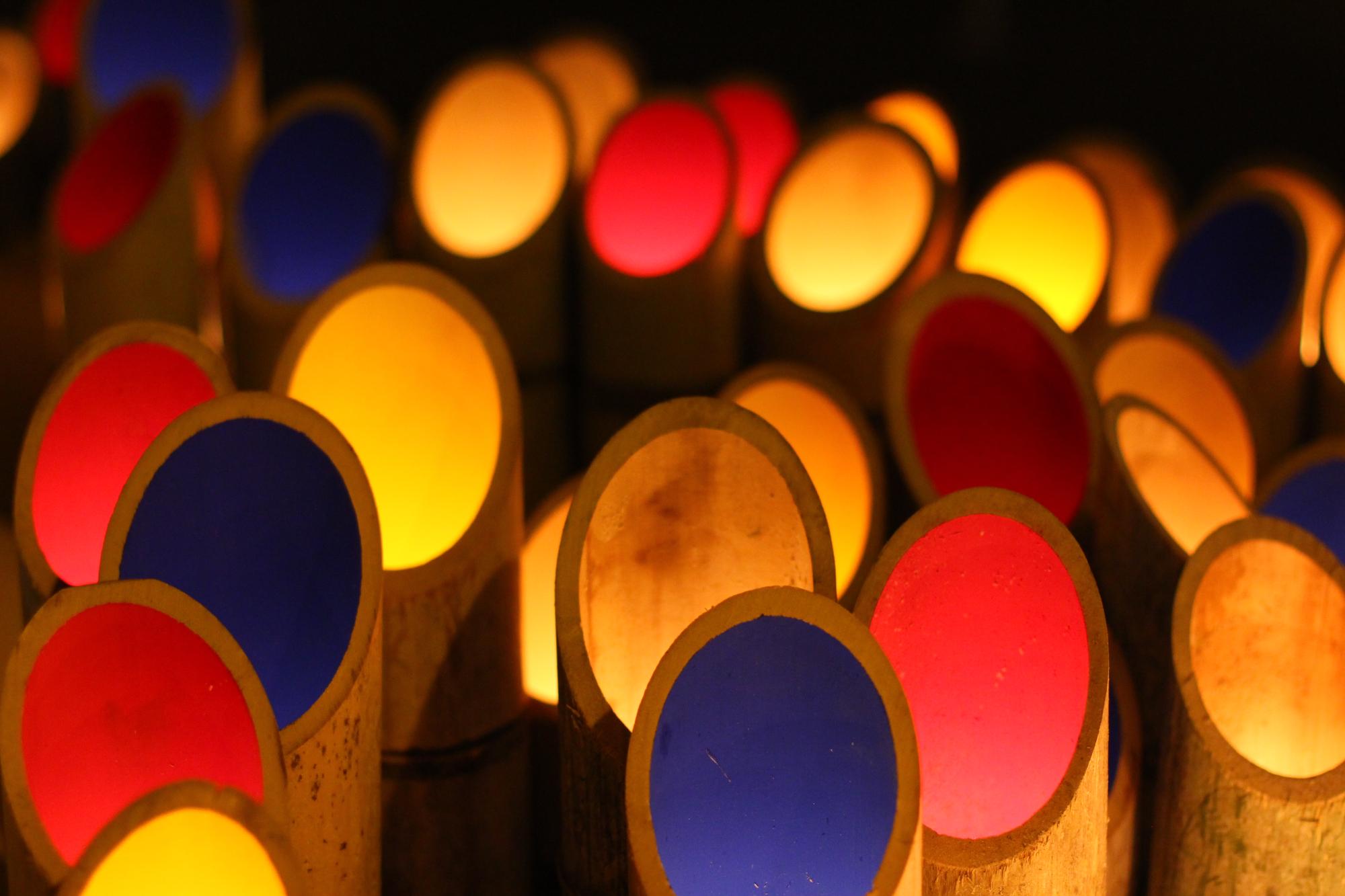 豆田の人たちを中心に真心を込めて作られた無数の竹灯籠が、「伝統的建造物群保存地区」にも指定されている豆田町の古い町並みと、「水郷ひた」のシンボルの一つでもある花月川をやさしく照らします。