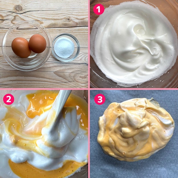 ① 卵は卵白と卵黄に分ける。ボウルに卵白と砂糖を入れ、泡立て器かハンドミキサーを使って泡立て、メレンゲにする。