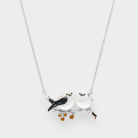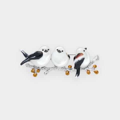 「シマエナガ団子」の愛称で親しまれる、木の枝に集まり仲良く並んでいるワンシーンを切り取ったデザインのネックレスとブローチもラインナップされています。