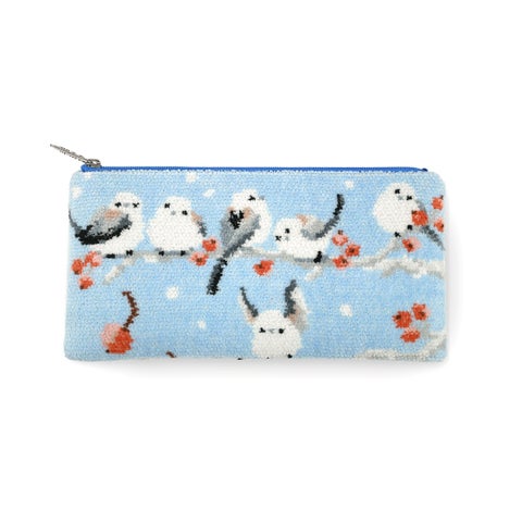 これらのアクセサリーに付属する「セットポーチ(スクエア型)」も、ヴァンドームブティックオリジナルデザインのフェイラー製ポーチです。木の枝に集まり仲良く並んでいる「シマエナガ団子」が描かれており、コスメやステーショナリーをまとめるのに適した長方形タイプとなっています。