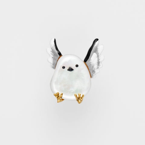 空をきょとんと見上げるシマエナガの姿を表現。メタルはやわらかく指を包み込むような優美な曲線を描き、上質な淡水パールを雪に見立てています。
