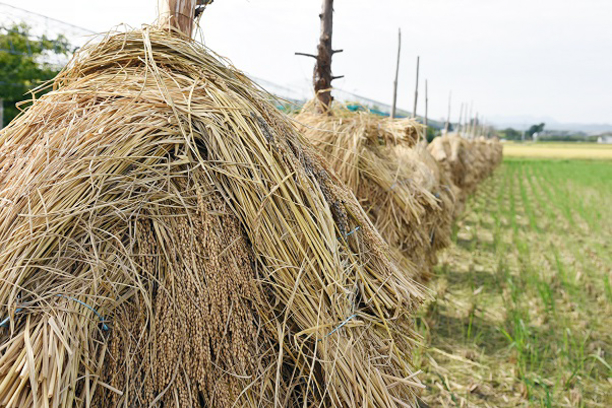 収穫した藁は「杭掛け」でじっくり自然乾燥させたあと、丁寧に脱穀。