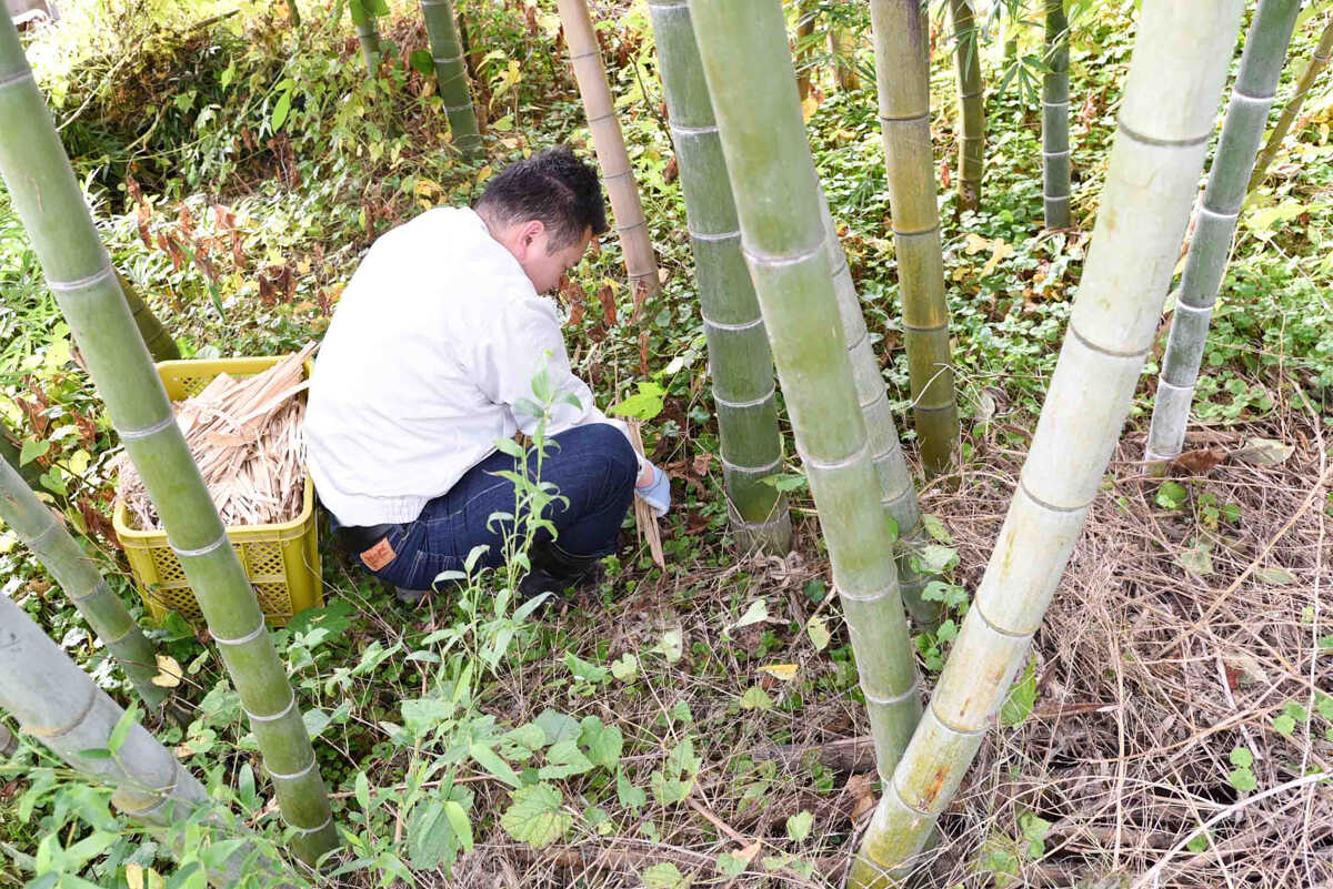 山奥で背負いカゴいっぱいに収穫し、乾燥と薫蒸(くんじょう)を経て、斑点の少ない上質な竹皮のみが使用されます。