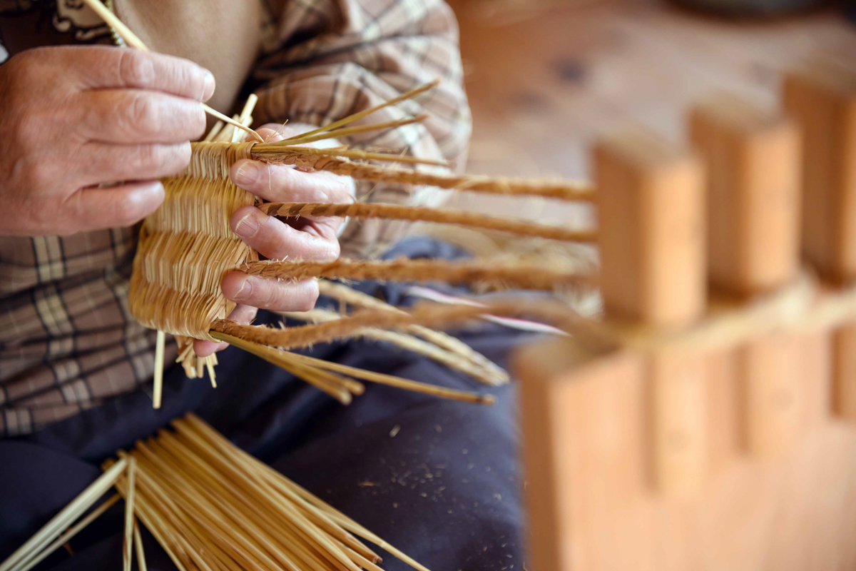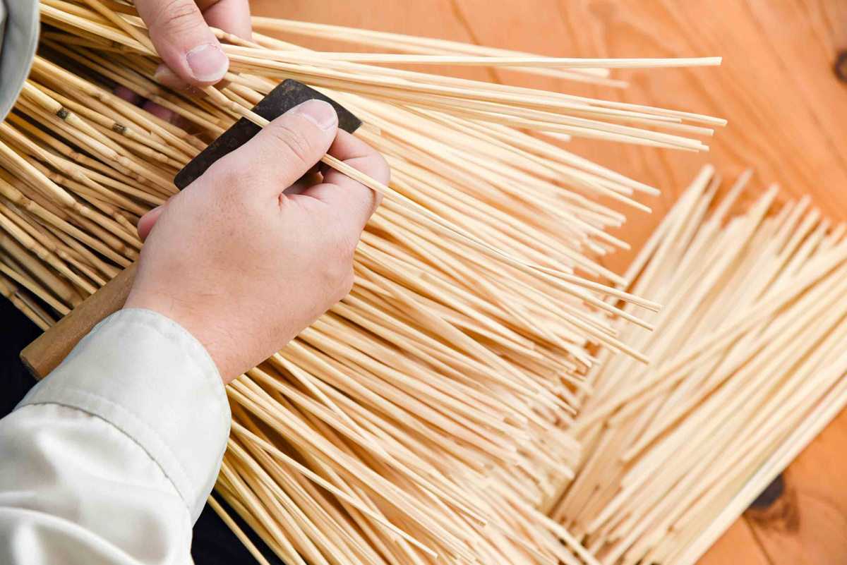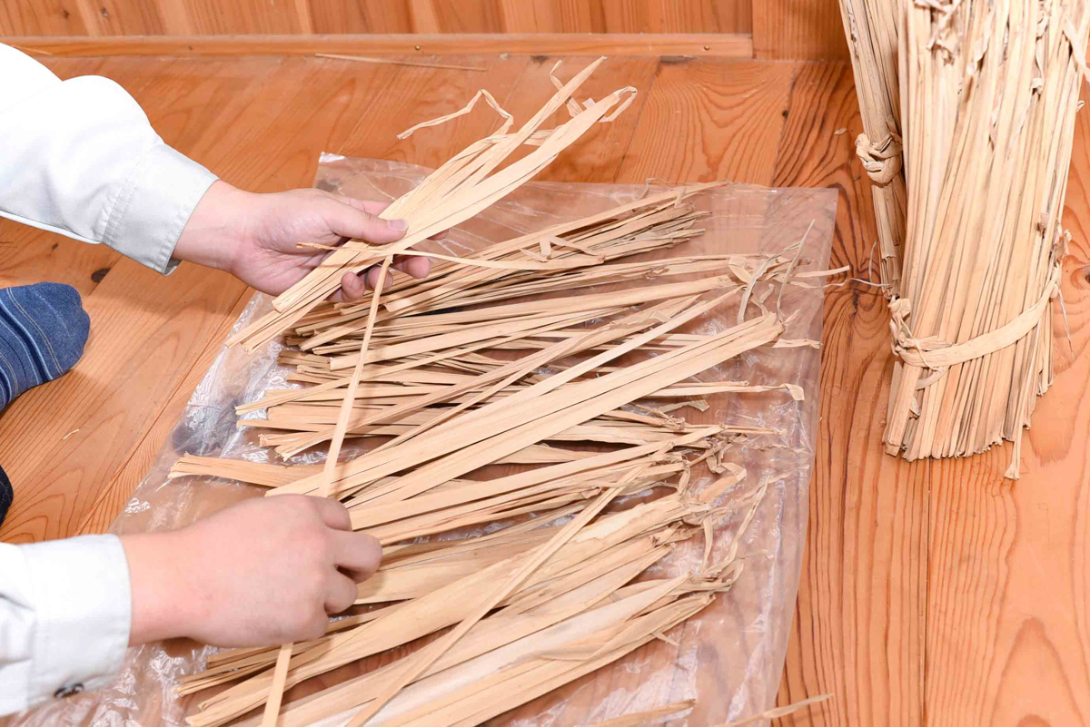 乾燥した藁は「節」を一本一本切り出し、長さや太さを職人の指先で見極めながら整えていきます。