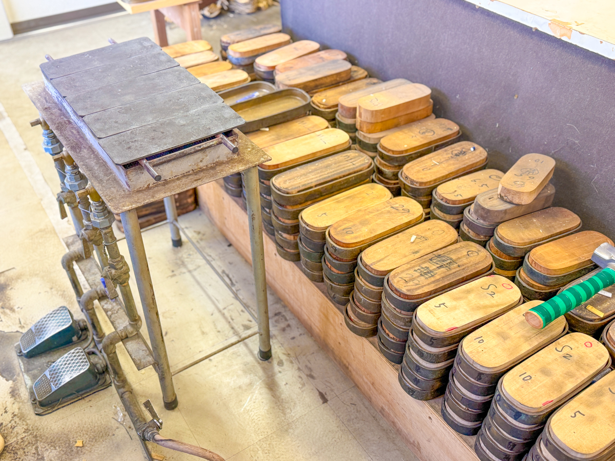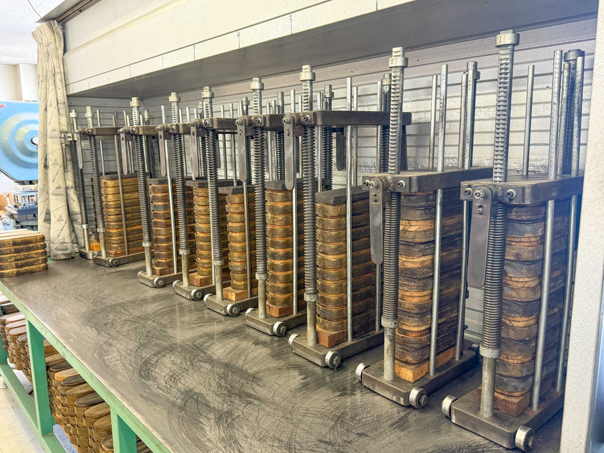 金型に草履をセットし高温で熱した後は、油圧プレス機に並べて一気に圧搾。