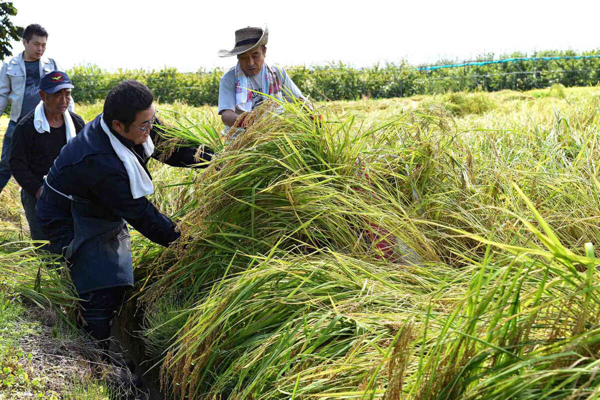 秋には倒れやすくなった藁を起こしながら、手刈りやバインダーを使って丁寧に収穫していきます。