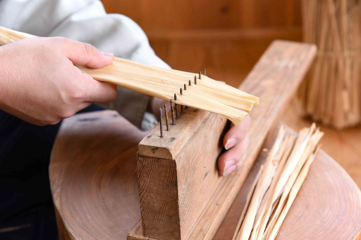 一方、ぬるま湯に浸けて柔らかくした竹皮は、「皮裂き器」で丁寧に裁断されます。