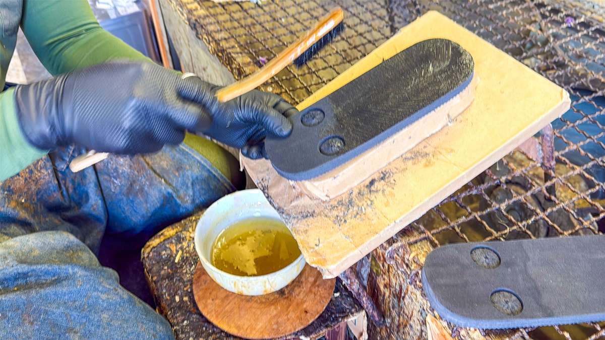 今回の体験では、この圧搾された草履をベースに、「鼻緒付け」などの仕上げ作業を行います。