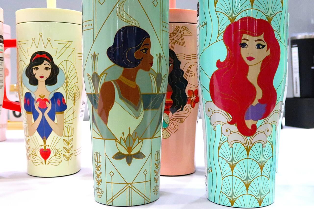 他にも、アリエル、モアナ、ベル、白雪姫、とプリンセスデザインのドリンクボトルが並んでいました。